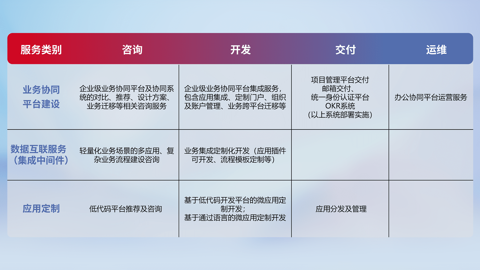 针对钉钉、、、企微、、、IDaas等平台级产品提供产品的规划、、、方案、、、、交付、、定制化开发等服务,,实现如统一协同办公、、智能客户服务、、混合会议管理、、、、智能数据查询、、、、等业务场景,,实现数字化转型。。