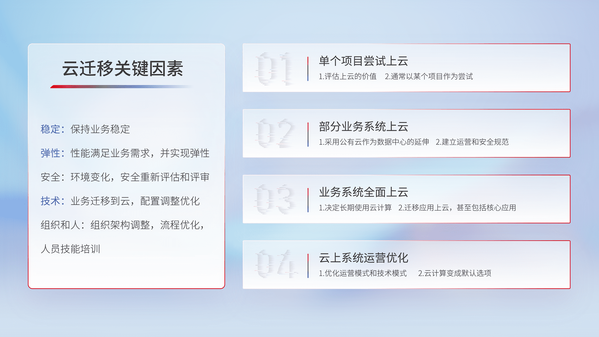 结合实际业务,,,,从规划设计、、云平台选型、、、、云原生改造、、、数据迁移、、、集成交付,,,,迁移全过程为客户识别最佳上云路径,,,,做好风险识别管理,,,,设计网络架构、、、身份权限、、、、安全审计合规、、操作审计、、、日志审计、、监控告警策略、、、多站点容灾设计等,,,,对云上基础设施进行整体规划,,提升IT治理水平,,以满足弹性、、高可用、、、高性能的需求。。。