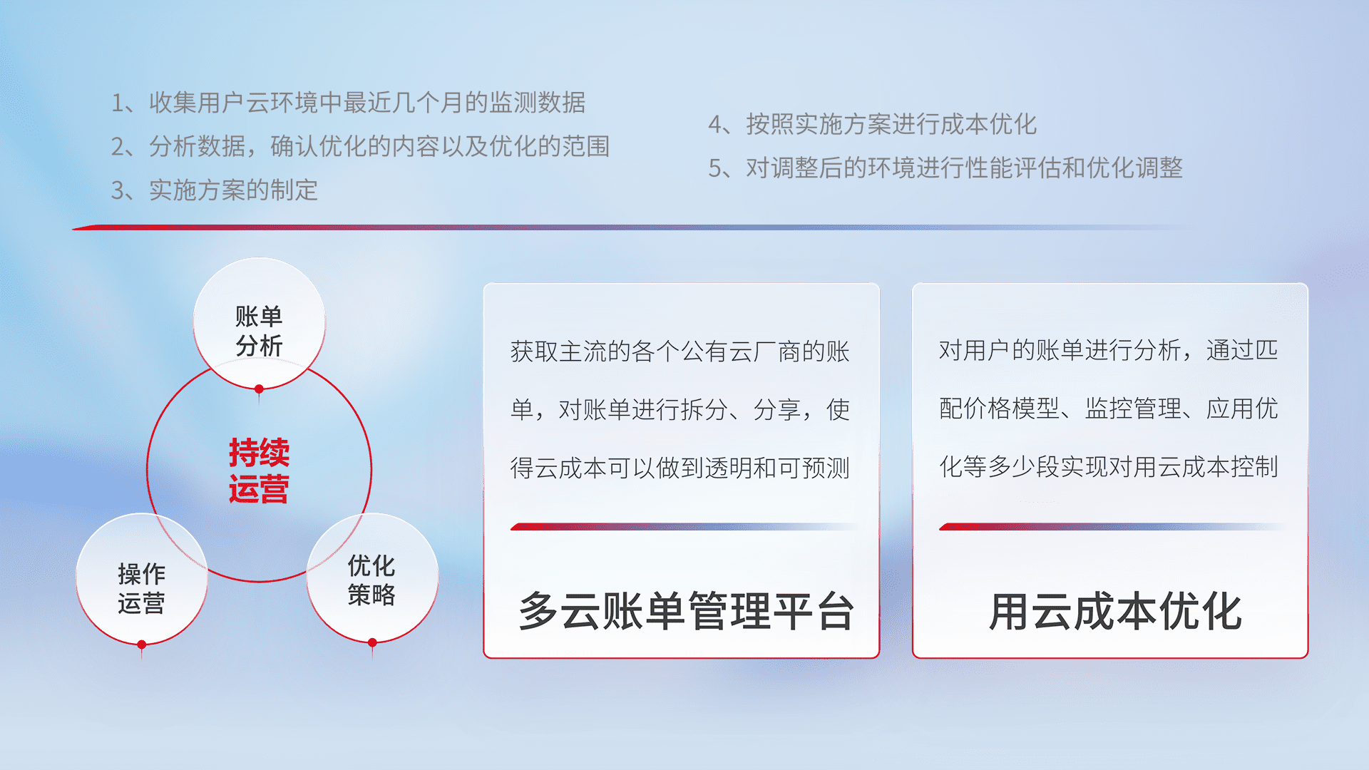 通过多云纳管,,以统一的资源数据模型把客户的云资源进行抽象和封装,,,进而实现对多云资源的统一操作,,,,保障云资源管理的可靠性、、稳定性与可用性。。。。量身定制化运维内容,,,配置、、、开发运维、、、补丁管理、、、备份、、、监控、、、认证和访问管理、、、审计和日常巡检等,,保障在用云过程中的可靠度,,,,稳定度以及高可用率。。。。