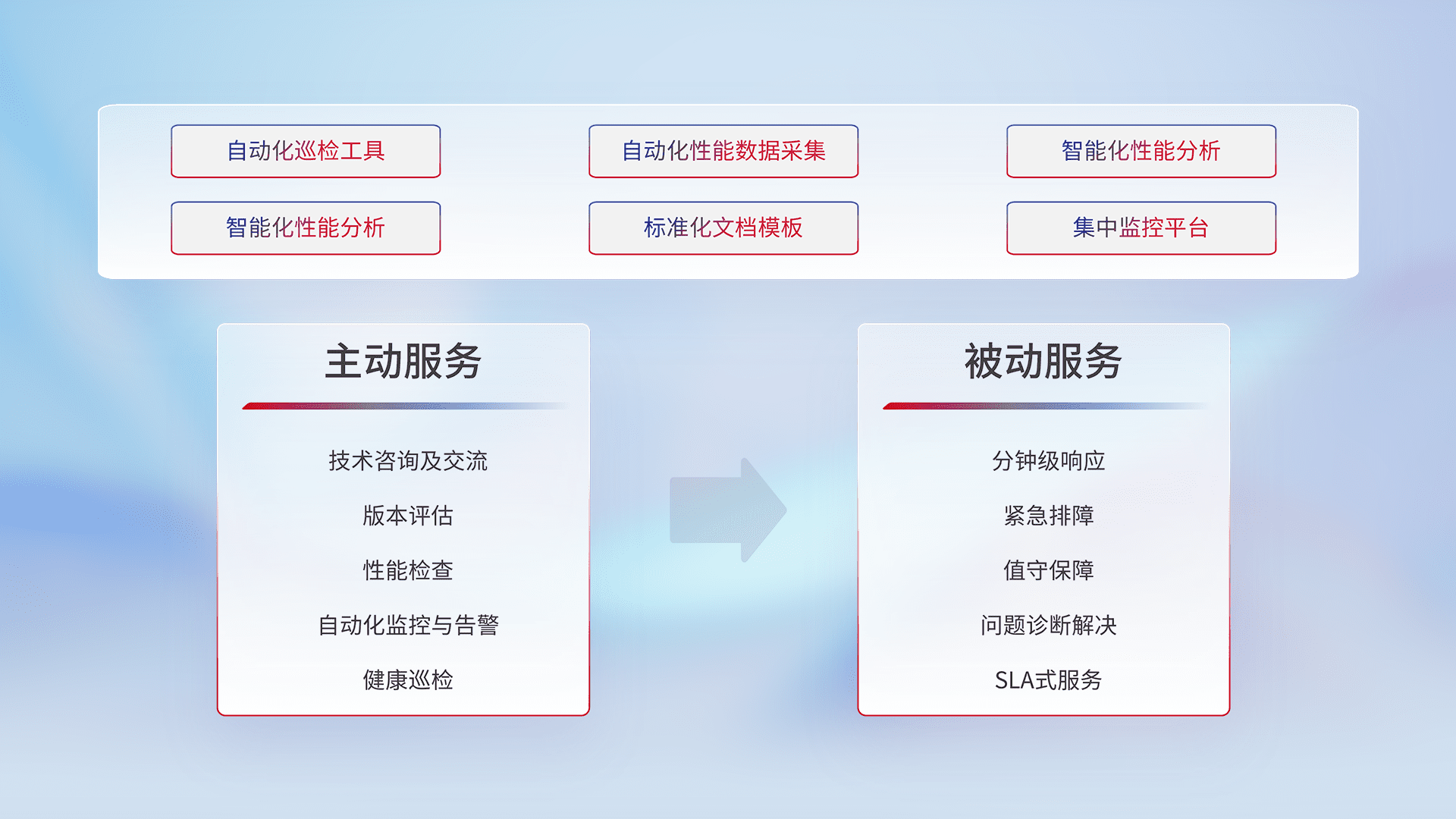智能化工具和标准化文档,,,保障服务质量,,提供主动服务(包含技术咨询、、、版本评估、、、、性能检查、、自动化监控与告警、、健康巡检)和被动服务包含(分钟级响应、、、紧急排障、、、值守保障、、问题诊断解决、、SLA服务)。。